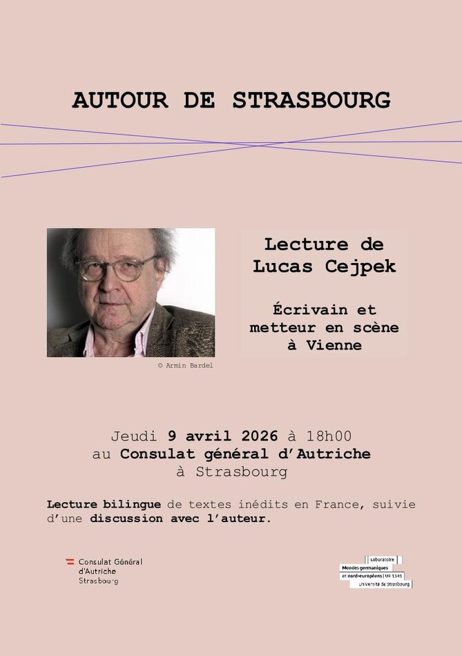 Lucas Cejpek lira des extraits de Du siehst Gespenster und nichts in der Minibar (Tu vois des fantômes et rien dans le mini-bar) et Quer zur Schreiblinie (En travers de la ligne d’écriture), qui évoquent différents endroits de Strasbourg où il a pu séjourner à plusieurs reprises. Lucas Cejpek développe une écriture en mouvement qui détache le matériau de son ancrage spatio-temporel, non pas dans un souci d’abstraction, mais afin de rendre les événements historiques productifs pour le présent. L’écrit reste ouvert au dialogue à partir duquel les pensées s’enchaînent, par glissements de sens et moments de tension, conférant au texte une dimension dramaturgique.